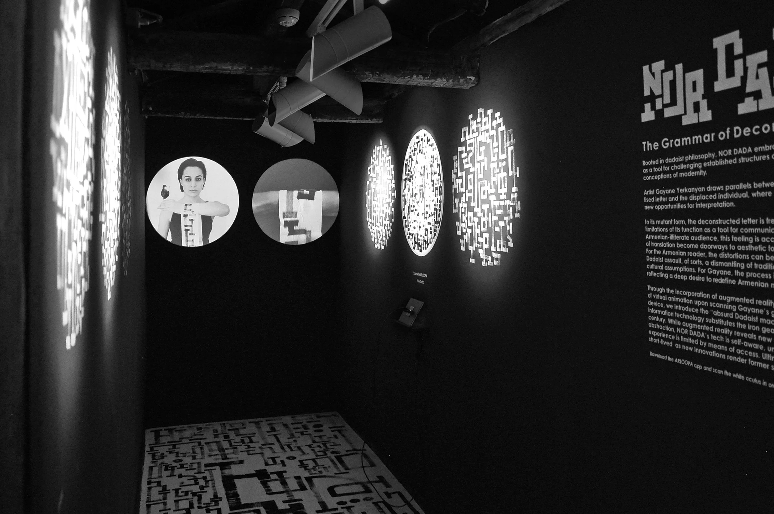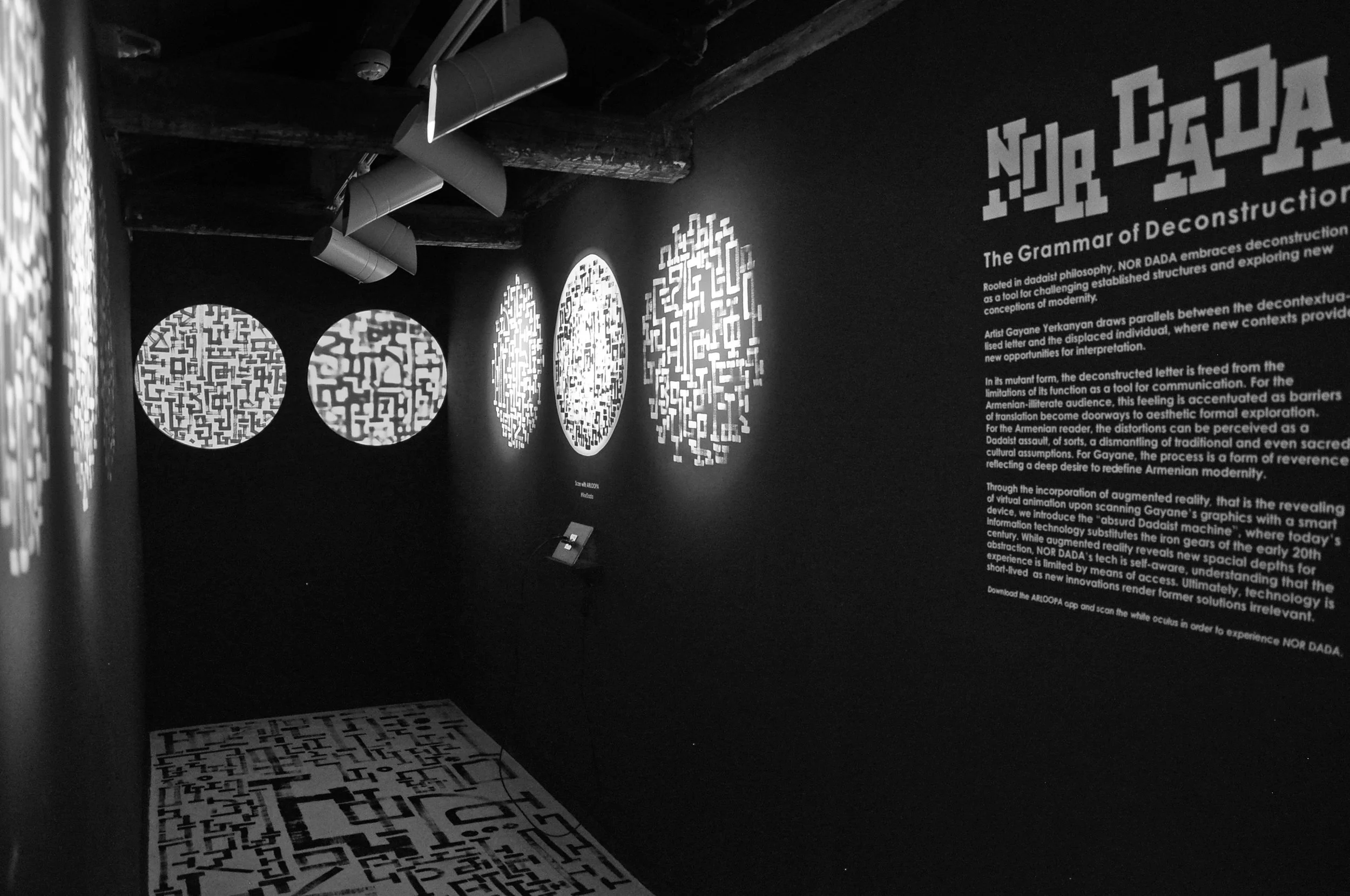 Through the incorporation of augmented reality, that is the revealing of virtual animation upon scanning Gayane’s graphics with a smart device, we introduce the “absurd Dadaist machine,” where today’s information technology substitutes the iron gears of the early 20th century. How has IT changed the artist’s craft, lifestyle, and the viewer’s experience of the visual world? The absurdity lies in questions of accessibility. The augmented reality experience predicates a smart device, but how long of a life span does this reality have? NOR-DADA’s tech component is self-aware, understanding that technology is short-lived, as new innovations render former solutions irrelevant.